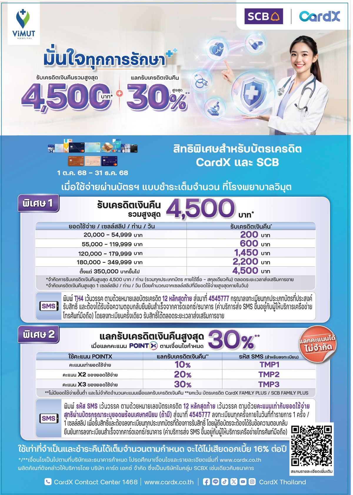 • สิทธิพิเศษสำหรับผู้ถือบัตรเครดิตคาร์ดเอกซ์ และบัตรเครดิตธนาคารไทยพาณิชย์ (“ผู้ถือบัตร”) ที่มียอดใช้จ่ายผ่านบัตรฯ (เฉพาะบัตรเครดิตที่ชำระเต็มจำนวน) ณ โรงพยาบาล, สถาบันสุขภาพ, ศูนย์ทันตกรรม และสถานเสริมความงามที่ร่วมรายการ ตั้งแต่วันที่ 1 มกราคม 2568 –  31 ธันวาคม 2568 โดยสิทธิพิเศษตามเงื่อนไขของโรงพยาบาล, สถาบันสุขภาพ, ศูนย์ทันตกรรม และสถานเสริมความงามที่ร่วมรายการกำหนด